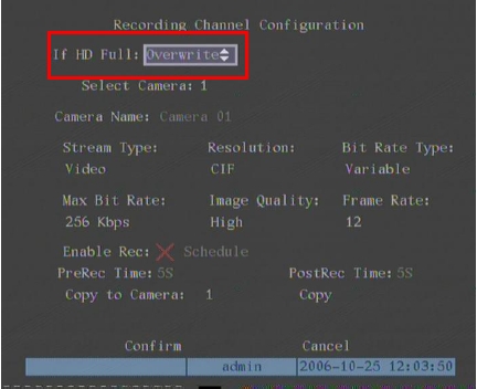 Chọn Overwrite cho phép ghi đè dữ liệu nếu ổ cứng đầy. Select Camera: chọn camera.