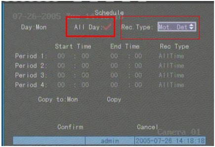 Chọn All Day (phần đánh dấu đỏ) lựa chọn cả ngày; nếu chọn theo ngày thì đánh dấu x. Trong phần Record type ta lựa chọn: All time, Motion Detect/ Alarm, Motion & Alarm tùy theo việc sử dụng.