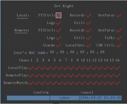 Từ menu “User Management” ta chọn “Defauft Rights” để lựa chọn những tính năng mặc định cho user mới như: Local playback, remote playback và view log. Ấn save để lưu lại cấu hình cho user mới.