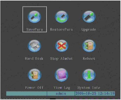 Các tiện ích : SavePara (lưu lại cấu hình), RestorePara (phục hồi cấu hình) , Upgrade ,Hard Disk, Stop Alarm Out, Reboot, Power Off, View Log and System Info.