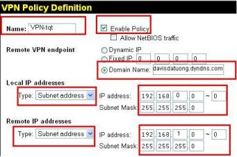 Trong phần Remote VPN Endpoint ta chọn Domain name và điền địa chỉ tên miền động đã cấu hình trên thiết bị VRT-401 tại chi nhánh. (ví dụ: davistqt.dyndns.org).