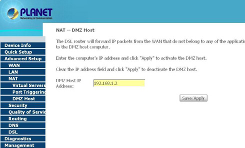 Bước 3: Điền địa chỉ IP của thiết bị bạn muốn chia sẻ vào DMZ Host IP Address. Ấn Save/Apply để lưu cấu hình.