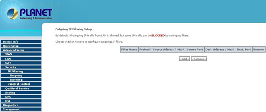 Bước 2: Chọn Advance Setup-> Security -> IP filtering. Màn hình giao diện hiện lên như sau: