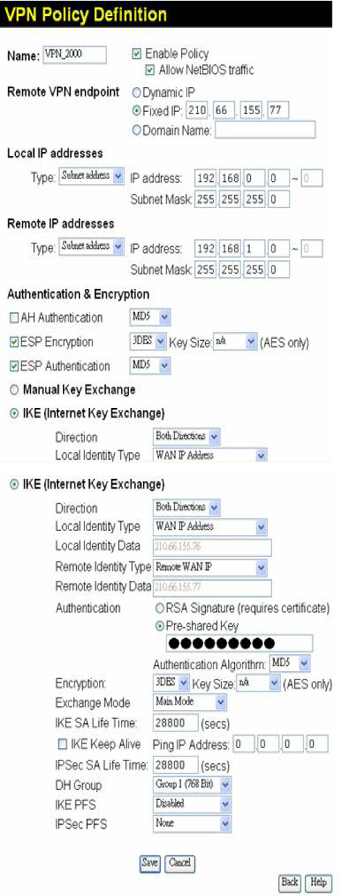 Bước 1: Thiết lập kết nối theo mô hình, giả sử địa chỉ Internet và địa chỉ LAN cho phía trụ sở chính là: 210.66.155.77 và 192.168.1.0/24. Địa chỉ Internet và địa chỉ LAN cho phía chi nhánh là: 210.66.155.76 và 192.168.0.0/24.