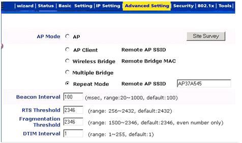 Truy cập câu hình AP như bài hướng dẫn cài đặt cơ bản chọn Advanced Setting , đánh dấu chọn Repeater Mode, điền SSID của AP ở chế độ AP Mode vào ô  Remote AP SSID, hay nhấp nút “Site survey”sau đó nhấp Apply. Các thông số còn lại để mặc định
