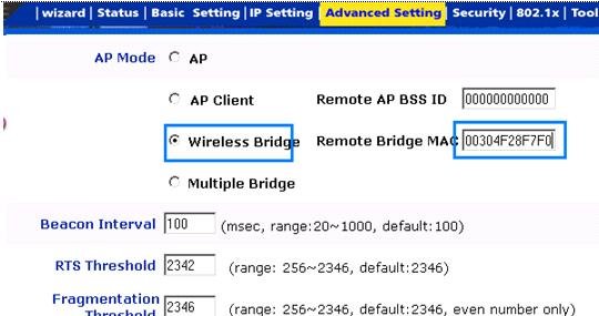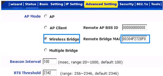 Kết nối không dây 2 mạng Lan ở cách xa nhau. Mỗi mạng có một AP làm việc ở chế độ Bridge và ta cần phải cấu hình 2 AP này (2 AP ở cách xa nhau chính vì vậy ta cần phải kết nối thêm Angten có độ khuếch đại cao) . Khi 2 AP thiết lập ở chế độ này chúng chỉ có nhiệm vụ kết nối 2 mạng Lan đó với nhau, còn muốn kết nối với Internet thì chúng ta vẫn phải thông qua Gateway như mục Hướng dẫn cài đặt cơ bản AP