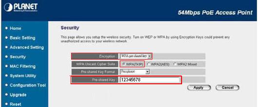 (ở ví dụ dưới chúng tôi chọn kiểu mã hóa WPA (TKIP) với mã là 12345678)