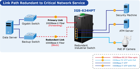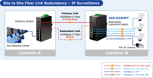Thiết bị tích hợp bộ điều khiển DIP, IGS-624HPT hỗ trợ chế độ chuyển mạch 6 cổng hoặc chuyển mạch dự phòng 4 cổng + 2 cổng kết nối quang. Với chế độ 6 cổng chuyển mạch, IGS-624HPT hoạt động với cơ chế nhận và chuyển tiếp gói tin, với chế độ dự phòng chuyển mạch 4 cổng + 2 cổng kết nối quang, thiết bị mang đến khả năng dự phòng mạnh mẽ cho các ứng dụng Ethernet. Chế độ dự phòng hỗ trợ khả năng tự phục hồi. Nếu cổng kết nối bị mất liên kết thì các gói tin sẽ tự động chuyển sang cổng dự phòng