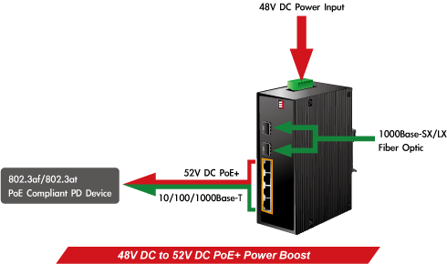 Thiết bị hỗ trợ cấp nguồn PoE IEEE 802.3at hỗ trợ cấp nguồn một chiều 48V được sử dụng cho môi trường công nghiệp, IGS-624HPT hỗ trợ nguồn từ 48V đến 52V tăng cường cho việc giải quyết cấp nguồn đặc biệt để đảm bảo mức độ hiệu quả của việc cấp nguồn PoE+. Để nâng cao tính linh hoạt và độ tin cậy, IGS-624HPT hỗ trợ nguồn một chiều đầu vào cho việc dự phòng.