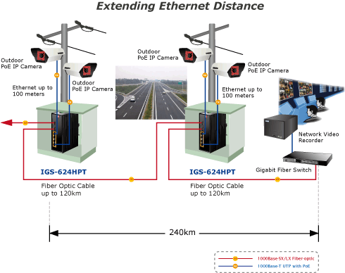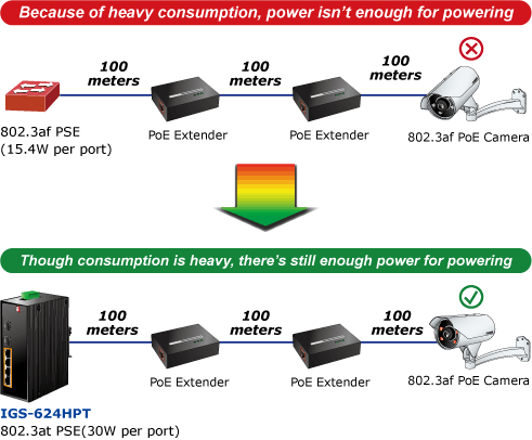 Với công suất 30W PoE đầu ra, IGS-624HPT có thể mở rộng khoảng cách cấp nguồn nhờ sử dụng bộ mở rộng PoE cho việc cấp nguồn IEEE 802.3af cho các thiết bị nhận nguồn PoE với khoảng cách tới 100m. Thiết bị có thể hỗ trợ nhiều bộ mở rộng PoE mang đến sự linh hoạt khi có thể tăng khoảng cách lên hai lần, ba lần thậm chí bốn lần cho khoảng cách cấp nguồn PoE