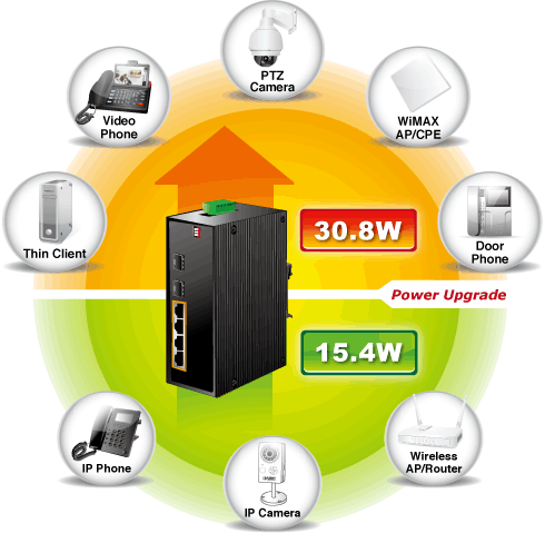 Để đáp ứng yêu cầu cấp nguồn PoE cho những ứng dụng mạng cung cấp 4 cổng 10/100/1000 Mbps chỗ trợ chuẩn cấp nguồn PoE IEEE 802.3af và IEEE 802.3at cung cấp công suất lên tới 30W trên mỗi cổng thông qua cáp CAT5E/CAT6. Với tổng công suất 120W trên toàn hệ thống. IGS-624HPT được thiết kế đặc biệt để đáp ứng nhu cầu ngày càng tăng về công suất tiêu thụ của các thiết bị mạng như camera hỗ trợ P/T/Z các thiết bị phát sóng không dây hỗ trợ kênh phát 802.11 a/b/g/n cho môi trường ngoài trời và các thiết bị PoE cung cấp với chuẩn PoE thông thường IEEE 802.3af