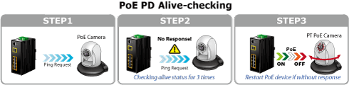 IGS-10020PT được cấu hình để theo dõi kết nối tình trạng nguồn thông qua việc ping.Khi thiết bị nhận nguồn PoE ngừng hoạt động và không có hồi đáp, IGS-10020PT sẽ cấp nguồn lại và giúp thiết bị có thể hoạt động lại. Thiết bị cũng tăng cường độ tin cậy trên các thiết bị PoE sau khi reset lại việc cấp nguồn giảm thiểu việc quản trị của nhà quản trị