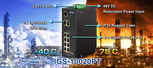 IGS-10020PT là thiết bi chuyển mạch hỗ trợ 8 cổng gigabit hỗ trợ PoE 802.3af, được hỗ trợ lớp vỏ kim loại IP30 phù hợp với môi trường công nghiệp nặng. Với lớp vỏ kim loại IP30 thiêt bị có khả năng chống lại nhiễu điện từ và nhiễm điện nặng trên bề mặt là hiện tượng thường gặp trên mặt sàn hay trên các tủ điện. Dải nhiệtđoộ hoạt động từ -40 ~ 75 độ C, giúp thiết bị có thể hoạt động trong bất cứ môi trường nào. IGS-10020PT cho phép dạng DIN rail hay gắn tường tiết kiệm không gian trong tủ điện