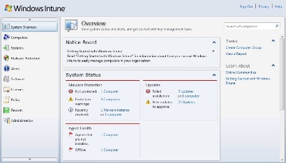 Windows Intune cho phép bạn có thể thực hiện điều này và cung cấp câu trả lời về những gì còn thiếu đối với điện toán đám mây – khía cạnh quản lý máy tính. Windows Intune là một dịch vụ đám mây của Microsoft, dịch vụ này cho phép bạn có thể quản lý và bảo mật các máy tính trong công ty từ bất cứ đâu thông qua giao diện web như thể hiện trong hình 1 bên dưới.