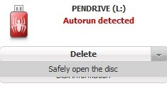 Từ hộp thoại này, bạn có thể nhấn nút Delete để xóa đi những mối nguy hại có thể lây nhiễm từ USB vào máy tính, hoặc bạn cũng có thể nhấn vào mũi tên nhỏ ở mục Delete, chọn ‘Safely open the Disk’ để mở và xem nội dung bên trong thiết bị ở chế độ an toàn, mà virus không thể phát huy tác dụng và lây nhiễm vào máy tính.