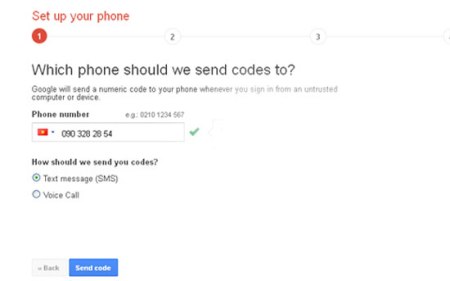 Tiếp theo bạn nhập số điện thoại và chọn cách nhận mã chứng thực qua tin nhắn (text messages) hay cuộc gọi thoại (voice call – ở đây bạn sẽ nhận được một cuộc gọi tự động đọc cho bạn mã xác nhận băng tiếng Anh). Bạn nên chọn hình thức SMS và nhấn Send code. Sau vài giây hệ thống sex gửi vào điện thoại của bạn mã số đăng ký.