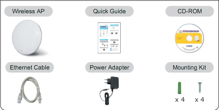 Phụ kiện đi kèm rất đầy đủ bao gồm: một cáp Ethernet RJ-45 chiều dài 1 m, một adapter cấp nguồn cho thiết bị với đầu ra 9V- 0.6A; đi kèm với thiết bị còn có một đĩa CD tài liệu thiết bị và cách hướng dẫn cài đặt nhanh cho thiết bị WNAP-C3220; cùng với đó là bộ ốc vít để có thể cố định thiết bị lên trần nhà