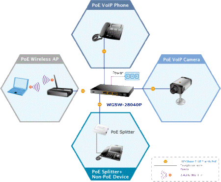 Đường dây PoE tuân theo chuẩn IEEE 802.3af để WGSW-28040P có thể cấp điện cho 24 thiết bị tương thích với PoE của thiết bị ở khoảng cách 100 mét thông qua dây cáp có 4 cặp đôi Cat 5/5e UTP. Với việc dữ liệu và điện được truyền từ một khối, thiết bị giúp cho các doanh nghiệp có thể dễ dàng xây dựng một hệ thống IP Phone, hệ thống IP Camera hay các nhóm AP không dây với nguồn điện quản lý tập trung.. Nhờ công nghệ PoE cho phép một sợi dây mang cả tín hiệu điện và dữ liệu, WGSW-28040P sẽ làm giảm chi phí và thời gian lắp đặt cáp, các ổ cắm điện trên tường, trần nhà hay những khu vực khó đi dây cũng sẽ không còn cần thiết. Do đó, WGSW-28040P giúp cho các doanh nghiệp vừa và nhỏ giảm chi phí lắp đặt, đồng thời đơn giản hóa việc cài đặt và loại bỏ sự cần thiết của dây điện.