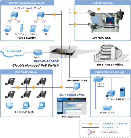 Cung cấp 24 cổng PoE sử dụng giao thức power in-line, thiết bị WGSW-28040P có thể giúp cho các doanh nghiệp dễ dàng xây dựng các hệ thống IP Phone, Camera IP hay các nhóm AP không dây được kiểm soát nguồn điện tại trung tâm. Ví dụ như các IP camera hoặc wireless AP có thể dễ dàng cài đặt trong công ty dùng cho nhu cầu giám sát hoặc xây dựng môi trường chuyển vùng không dây trong văn phòng công ty. Ngoài việc giới hạn ổ cắm điện, thiết bị Switch quản lý PoE giúp cho việc triển khai hệ thống IP camera hoặc Wireless LAN AP trở nên dễ dàng và hiệu quả hơn.