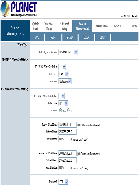 Tiếp đến bạn cần cấu hình theo chiều Outgoing, để kiểm tra xem địa chỉ mà bạn không muốn cho một máy tính nào đó trong mạng của mình truy cập ra ngoài theo một cổng được định nghĩa trước thì bạn cần biết địa chỉ đó là địa chỉ bao nhiêu? Cổng sử dụng là cổng nào? Trong bài viết này tôi lấy ví dụ địa chỉ là: 200.125.162.11 và cổng sử dụng là 8025 tiếp đó bạn cần chọn giao thức là TCP hay UDP trong bài này tôi chọn giao thức TCP. Các thông số khác sẽ thay đổi phụ thuộc vào mục đích của bạn. Tuy nhiên về cơ bản thì những thông số tôi điền ở hình bên dưới là cần thiết.