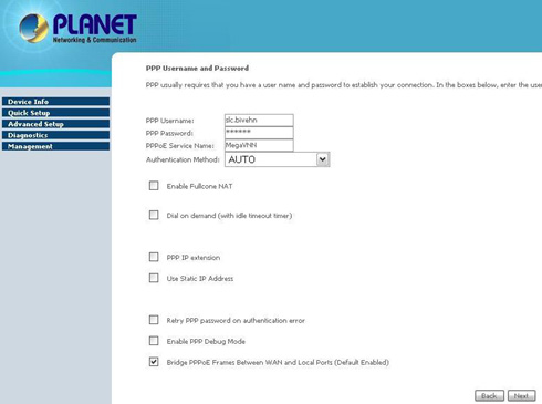 Thông thường các thông số mặc định với modem ADE-3410 v2 của Planet như sau: