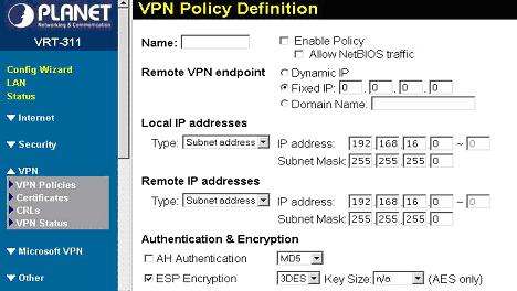 Các router của PLANET hỗ trợ VPN gồm VRT-401, VRT-311….Các router PLANET hõ trợ VPN thường theo chuẩn IP Sec với MD5-HMAC/SHA1-HMAC và xác thực quyền truy nhập, mã hoá theo DES-CBC và 3DES-CBC, Internet Key Exchange và Manual Key Negotiation.