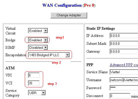 Điền các tham số VPI/ VCI của nhà cung cấp
