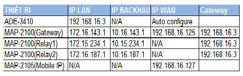 Để cấu hình được các thiết bị các bạn cần liệt kê địa chỉ IP và SSID cho các thiết bị, trong tài liệu này chúng tôi sử dụng các địa chỉ IP như sau |
