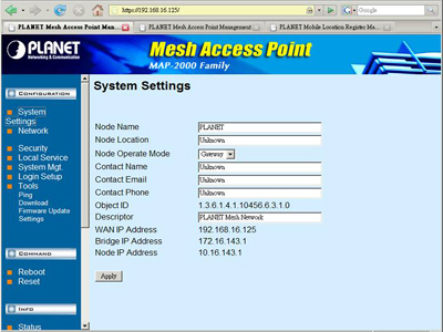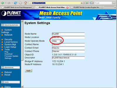 Cũng tương tự như cấu hình MAP-2100Gateway nhưng đơn giản và thực hiện ít bước hơn, tôi không đổi địa chỉ WAN của thiết bị nữa(do các MAP-2100relay không cần kết nối bằng cable Ethernet tới bộ chuyển mạch) mà tôi login vào địa chỉ LAN của thiết bị(địa chỉ này cũng được ghi kèm trong tài liệu hướng dẫn đi kèm,bài viết này tôi chỉ hướng dẫn cấu hình trên một thiết bị MAP-2100relay các thiết bị MAP-2100Relay khác các bạn thực hiện tương tự) https://172.15.234.1(bạn nhớ add thêm địa chỉ cùng với lớp địa chỉ này cho card mạng của bạn nhé) |