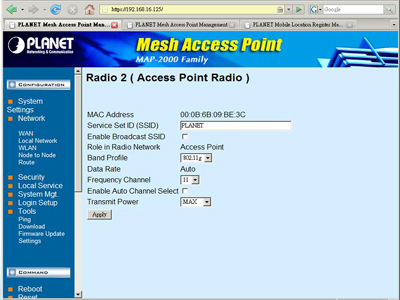 Tại đây bạn đặt tên cho SSID(chính là ID cho mạng không dây), tôi đặt tên là Planet, thông tin Band Profile là 802.11g, kênh 11 và Transmit Power tôi để MAX.