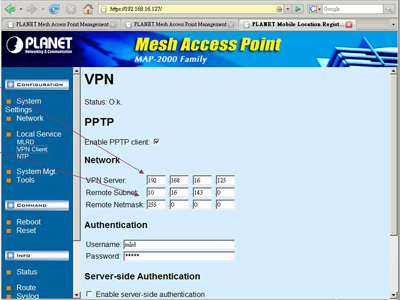 VPN Server: Tại đây bạn nhập địa chỉ WAN của MAP-2100(Gateway).