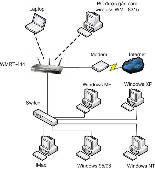 Trong bài hướng dẫn này chúng tôi hướng dẫn các bạn cài đặt một hệ thống mạng sử dụng WMRT-414 làm chức năng router và Wireless.