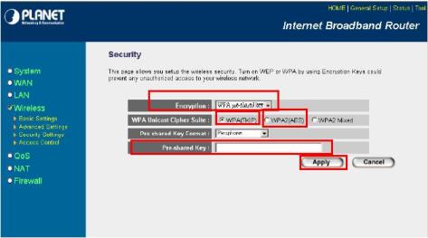 Chọn WPA (TKIP) hoặc WPA2 (AES) trong WPA Unicast Cipher Suite theo nhu cầu sử dụng.