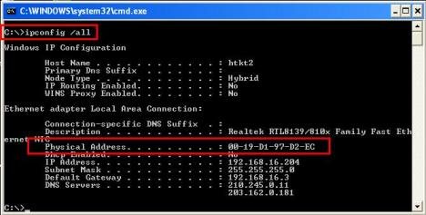 Trên máy tính ta chọn Start – Run, gõ CMD rồi tiếp tục gõ ipconfig /all để lấy địa chỉ MAC của máy tính