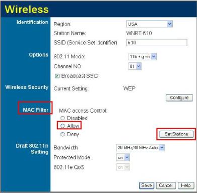 Từ giao diện chính chọn Wireless và chọn MAC Filter, chọn Allow trong MAC Access Control và chọn Set Station để cấu hình: