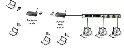 Các AP thiết lập ở chế độ Repeater cần một AP chính ở chế độ AP mode, các AP xung quanh thiết lập ở chế độ Repeater sẽ không cần kết nối mạng có dây với thiết bị, nhận sóng từ các AP phát sóng và có tác dụng lặp và tái tạo sóng nhằm tăng khoảng cách của chức năng AP phát sóng.