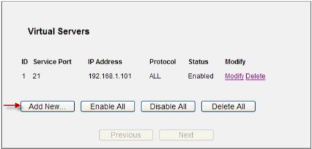 Một giao diện Virtual Servers xuất hiện cho ta biết những thông tin đã cấu hình như Service Port, IP Address hay trạng thái bật tắt dịch vụ, nhấp vào Add New… như hình dưới: