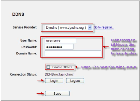 Nhấp vào Login để đăng nhập vào dịch vụ DDNS và Connection Status sẽ cho ta biết trạng thái kết nối với dịch vụ