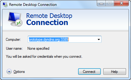 Trong phần Computer, bạn gõ địa chỉ chẳng hạn như prototype.dyndns.org:3389, sau đó nhấn Connect để kết nối với máy tính cần Remote.