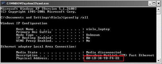 (địa chỉ MAC đưa vào ở đây là địa chỉ vật lý của card mạng trên máy tính của bạn. Để có thể lấy được địa chỉ này, bạn vào Start -> Run gõ lệnh cmd sau đó tiếp tục gõ lệnh ipconfig /all địa chỉ MAC sẽ hiện ra như hình dưới: