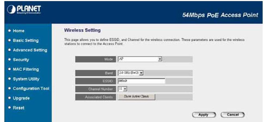 Ở màn hình giao diện, trong mục Mode bạn để AP; Band để 2.4GHZ (B+G+N); SSIDChannel number là tên và kênh hệ thống mạng không dây bạn có thể đăt tùy ý.