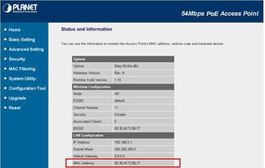 Để có thể lấy được địa chỉ MAC của thiết bị WAP-4033PE bạn có thể làm như sau: Trong giao diện cấu hình chọn mục Home. Địa chỉ MAC được ghi như trên hình sau: