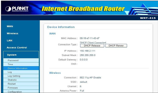 Các thông số mặc định của WNRT-415 khi cấu hình giao diện web như sau: