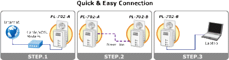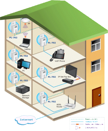 PLANET cung cấp một số loại sản phẩm powerline để đáp ứng các yêu cầu khác nhau về việc chia sẻ truy cập Internet ngay tại nhà. Như hình minh họa, người dùng có thể kết nối một IP Set-Top Box tới thiết bị Nano Powerline Adapter PL-702, hoặc kết nối máy tính tới PL-702 tại gia đình một cách dễ dàng. Với sản phẩm powerline của PLANET, không cần các bộ chuyển mạch truyền thông hay đi dây mạng phức tạp, người dùng hoàn toàn có thể thưởng thức mạng băng thông rộng tại nhà ngay từ bây giờ.