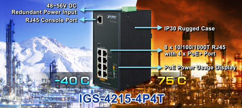 Hỗ trợ lớp vỏ bảo vệ IP30 IGS-4215-4P4T cung cấp một mức độ cao chống nhiễu điện từ và nhiễm điện bề mặt do lắp đặt trọng bề mặt tủ thiết bị mà không có điều hòa. Với dải nhiệt độ hoạt động từ -40 đến 75 độ C, IGS-4215-4P4T có thể hoạt động trong bất cứ môi trường nào