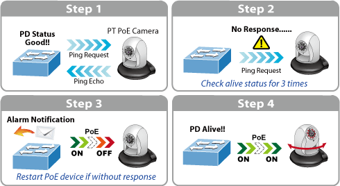 IGS-4215-4P4T được cấu hình để theo dõi kết nối tình trạng nguồn thông qua việc ping.Khi thiết bị nhận nguồn PoE ngừng hoạt động và không có hồi đáp, IGS-4215-4P4T sẽ cấp nguồn lại và giúp thiết bị có thể hoạt động lại. Thiết bị cũng tăng cường độ tin cậy trên các thiết bị PoE sau khi reset lại việc cấp nguồn giảm thiểu việc quản trị của nhà quản trị