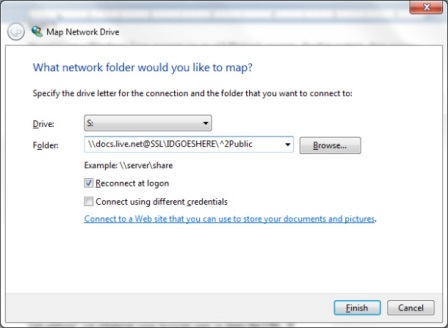 Để thực hiện, bạn tiếp tục mở My Computer và chọn Map network drive và chọn ký tự cho phân vùng lưu trữ này (ở ví dụ này là S), sau đó nhập đoạn mã dưới đây vào trường text bên cạnh Folder: \\docs.live.net@SSL\IDGOESHERE\^2Public.