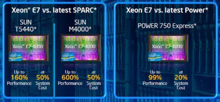 Bảng so sánh hiệu năng và chi phí khi sử dụng Xeon E7 so với chip các máy chủ các hãng khác.
